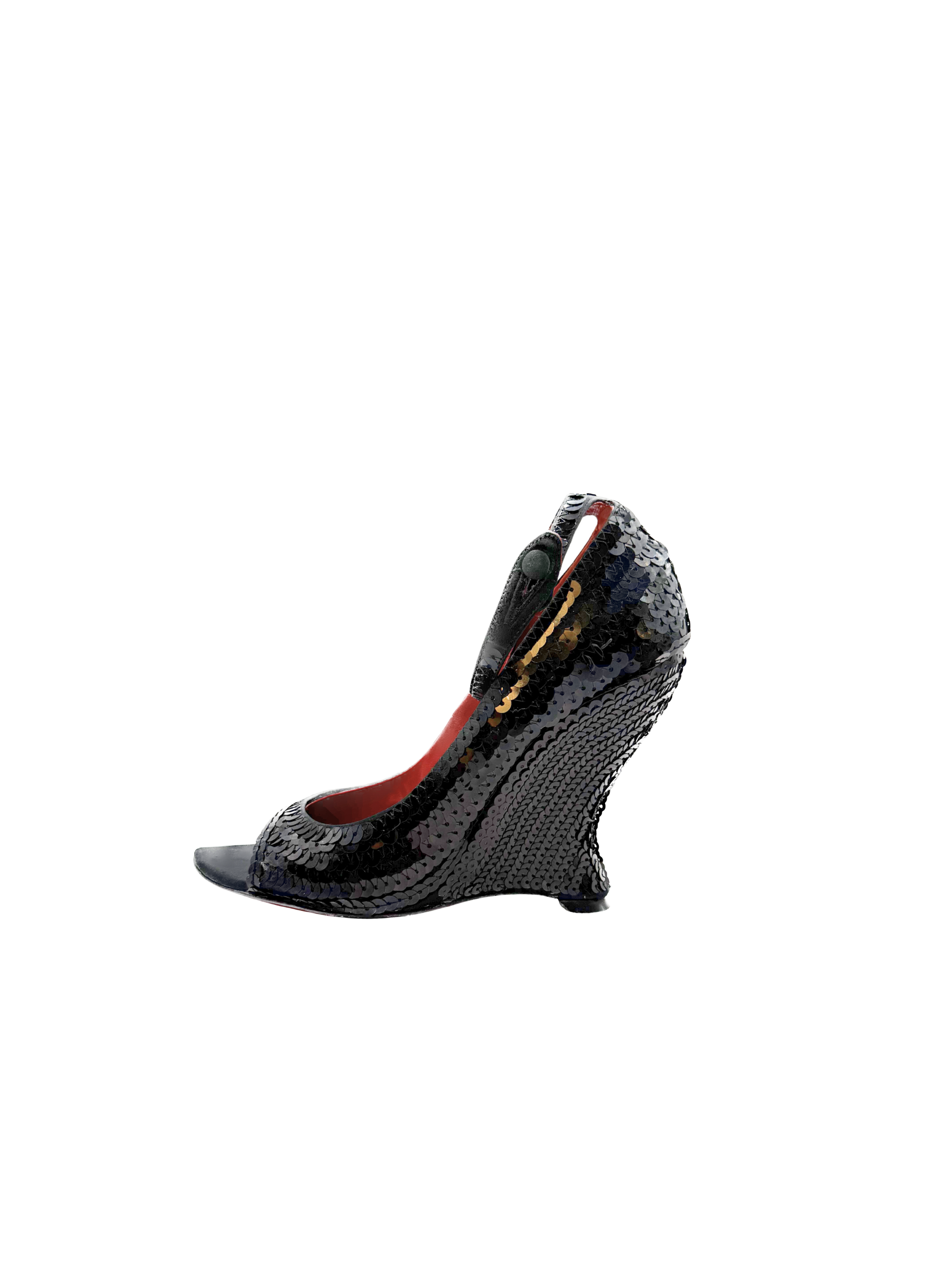 YSL by Tom Ford black sequin wedges with curved-in heel, circa Tom Ford's final season at YSL. F/W 2004